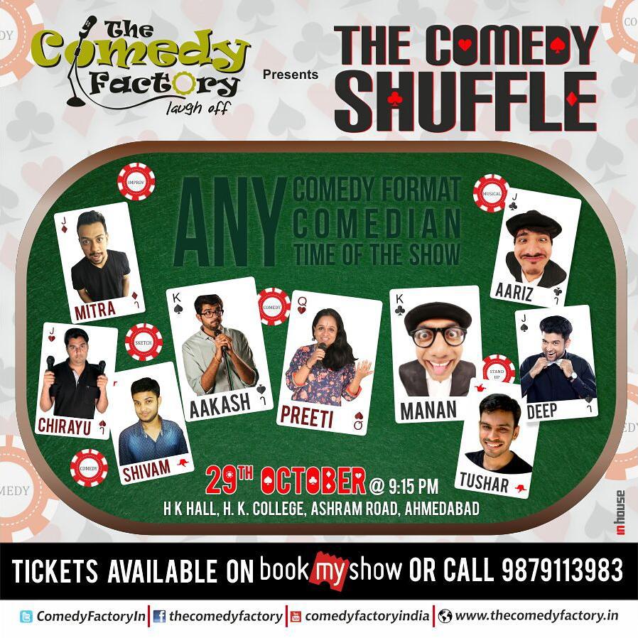 The Comedy Shuffle on 30th Oct at C.C.Mehta Audi, #vadodara. Tickets for Rs 200 & 300 available on Bookmyshow.com. #thecomedyfactory #Comedy